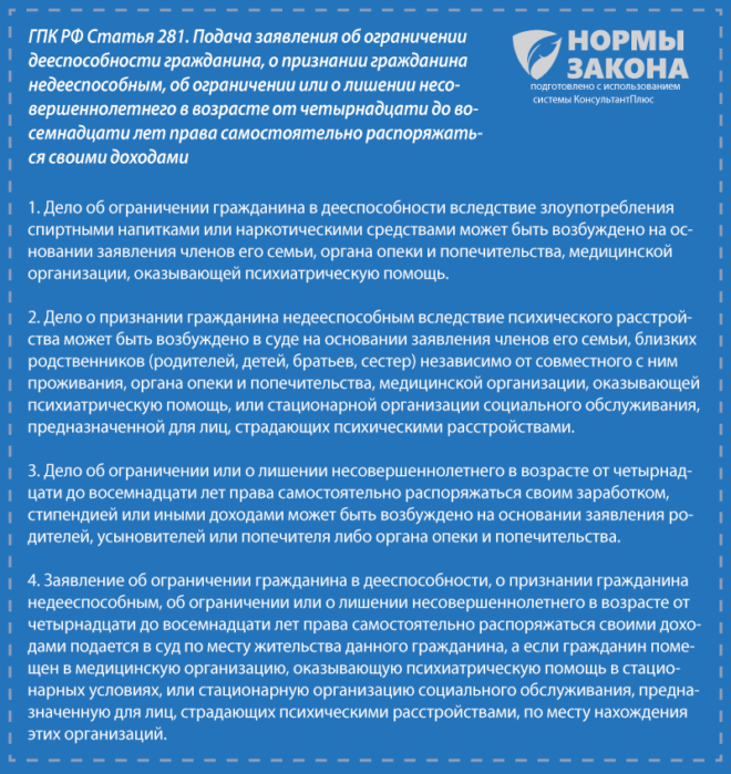 Подавать заявление в суд имеют право: близкие родственники человека и члены его семьи, медицинские учреждения психоневрологического и психиатрического профиля, органы опеки и попечительства.