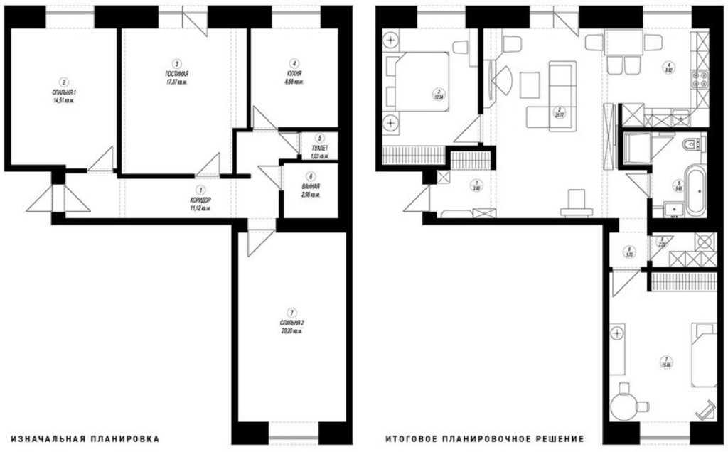 Здесь был реализован довольно стандартный объем мероприятий: снесена перегородка между кухней и комнатой, а вместо нее поставлен большой дверной блок во всю длину бывшей стенки. Туалет присоединили к ванной, причем площадь помещения слегка уменьшилась (срезан угол). Обычно бывает наоборот — совмещенный санузел расширяют на коридор, ведущий в кухню. Однако в этом случае требуемый участок коридора был занят гарберобной (6а). Перегородка и встроенная мебель, отделявшая смежную с кухней комнату от коридора были демонтированы, а жилую и нежилую зону разделили при помощи напольных покрытий.