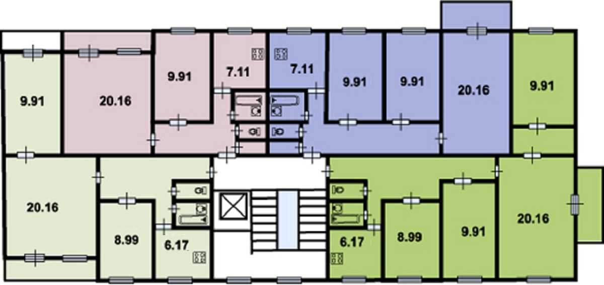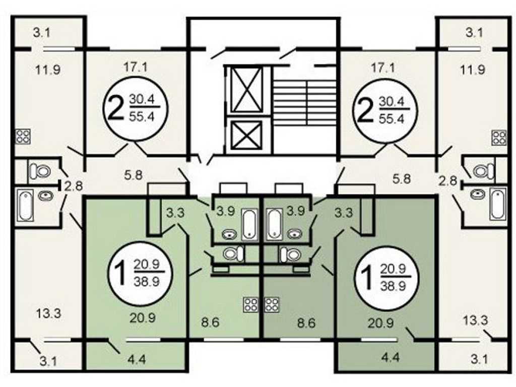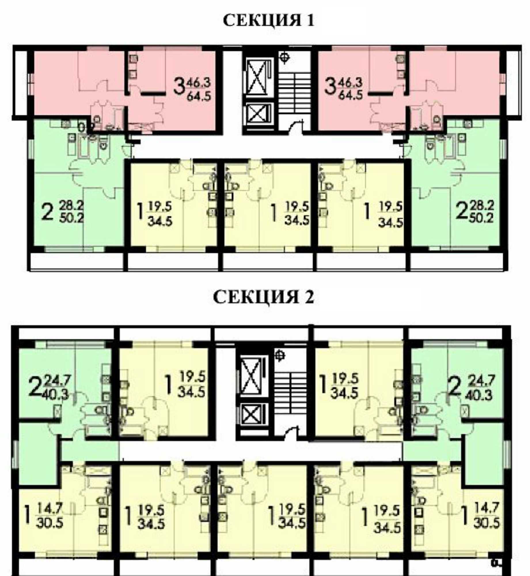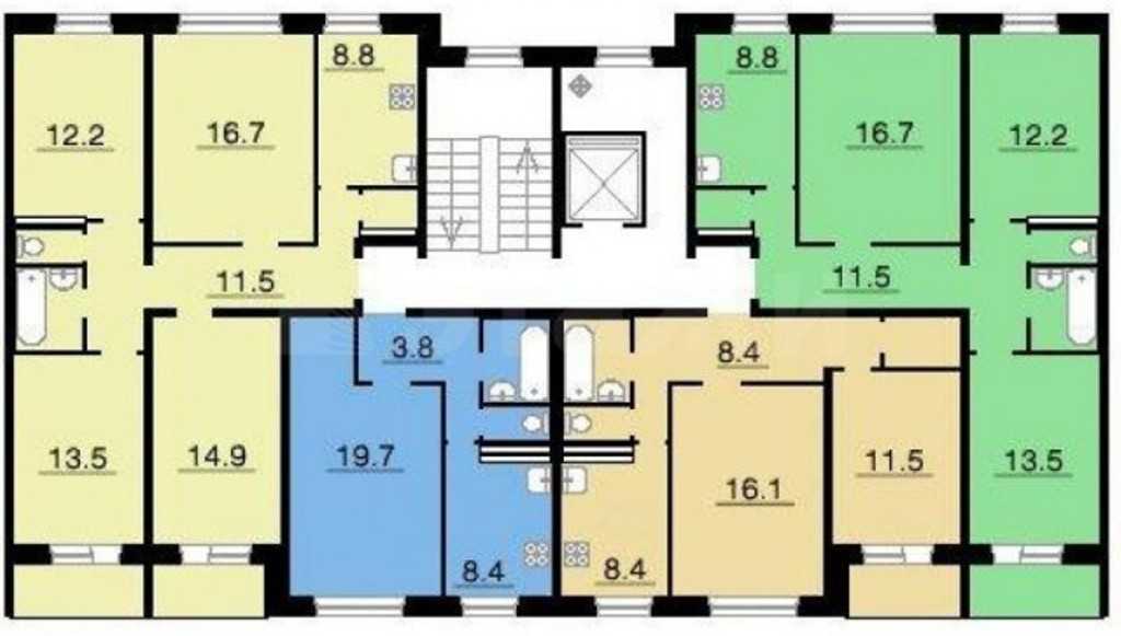 Планировка квартир в данном сегменте состоит из 4 или 8 рядовых угловых секций.
