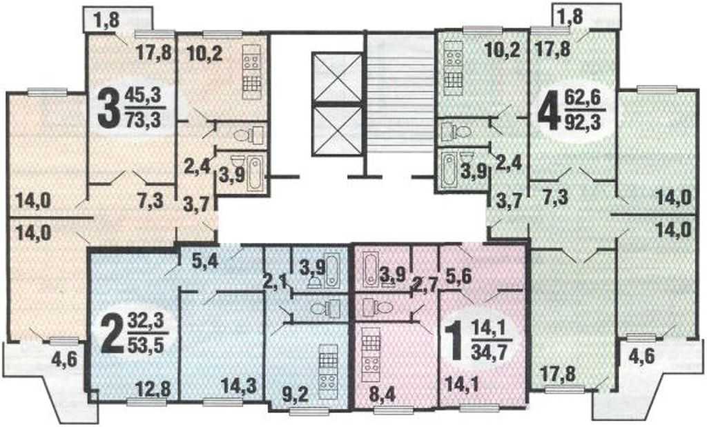 Эти квартиры также относятся к «брежневкам» и отличаются самой маленькой площадью – размеры трехкомнатной здесь всего 54-58 кв. м., кухни – 6-7 м. кв. В многокомнатных имеются кладовки, встроенные шкафы, паркетные полы. Само здание отличается повышенной прочностью, долговечностью. Основные недостатки подобного жилья – наличие проходных комнат.