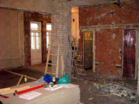 Ну что же, начнем ломать! Что ломаем? Да практически все! Точнее все некапитальные перегородки. Это кладовая и зал. Как правило перегородки сложены из гипсолитовых блоков 40*80 и достаточно хорошо поддаются ударам тяжелого молотка. Приготовьтесь к изнурительному тасканию мешков с камнями, скандалам с соседями по подъезду по поводу шума, вечно занятого лифта, мусора в подъезде, да и вообще вы негодяй. Почему? Да только потому, что у вас ремонт квартиры. Место во дворе следует заранее согласовать с местным ЖЭУ. Морально настройтесь на погрузку и вывоз 2 камазов мусора…. Да, веселенькая намечается работенка.