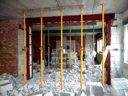 При демонтаже перегородок следует учесть тот факт, что в верхней части стены проложена проводка освещения, вмонтированы распредкоробки, розетки и выключатели. Поэтому ломать перегородку следует осторожно, малыми кусками, постепенно освобождая провода. Не забывайте о соседях снизу. Кусок блока, упавший с 2 метровой высоты, способен нанести ущерб квартире ваших соседей. Проводку следует сохранить без повреждений, так как она до конца ремонта квартиры будет служить в качестве рабочей. Лишним будет пояснение, что план электропроводки изменится кординальным образом. Проводку меняем полностью.