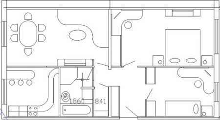 После сноса всех перегородок разметим новые. Поскольку гостиная и кухня у нас запланированы одним помещением, следует во первых, отделить зону кухни от прихожей (поскольку ни коридора ни прихожей у нас не осталось), во вторых, немного отделить от гостиной и загородить зону раковины и плиты. Как это будет выглядеть, видно из плана. Такое решение даст ряд преимуществ – у вас теперь получилась более менее закрытая от сквозного просмотра прихожая, кухня не мозолит глаза в гостиной как на витрине, да и возможностей для проектирования кухонного гарнитура появилось больше.