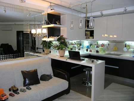 Кухню проще всего присоединить к гостиной. Полученное пространство выйдет весьма обширным, но газовую плиту придется заменить на электрическую, в целях соблюдения норм пожарной безопасности.