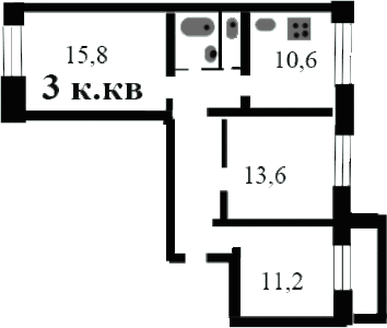 Также, в трехкомнатных квартирах есть кухня, которая составляет около восьми квадратных метров, и все кухонные окна выходят в одну сторону. Имеется лоджия (в 1-комнатных они отсутствуют).