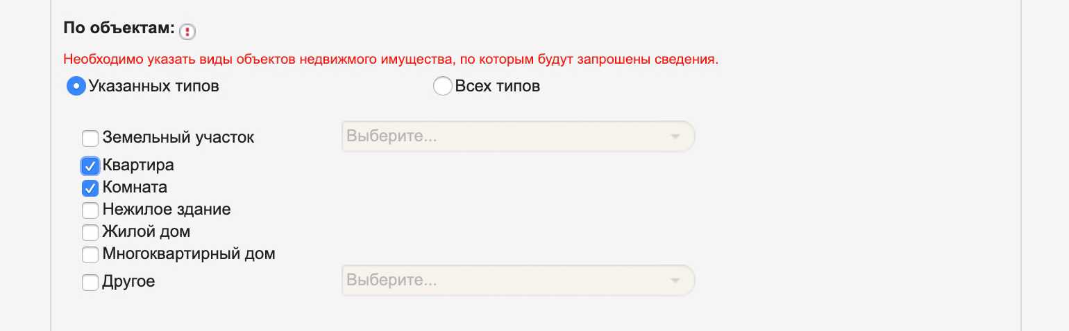 Если не знаете, какая недвижимость может быть в собственности, и хотите проверить все — выбирайте «Всех типов»