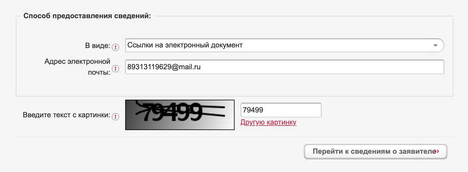 Через форму на сайте Росреестра можно получить электронную версию справки — без печати и подписи регистратора. Для этого в качестве способа получения сведений необходимо выбрать «В виде ссылки на электронный документ» и ввести адрес электронной почты, на который пришлют выписку.